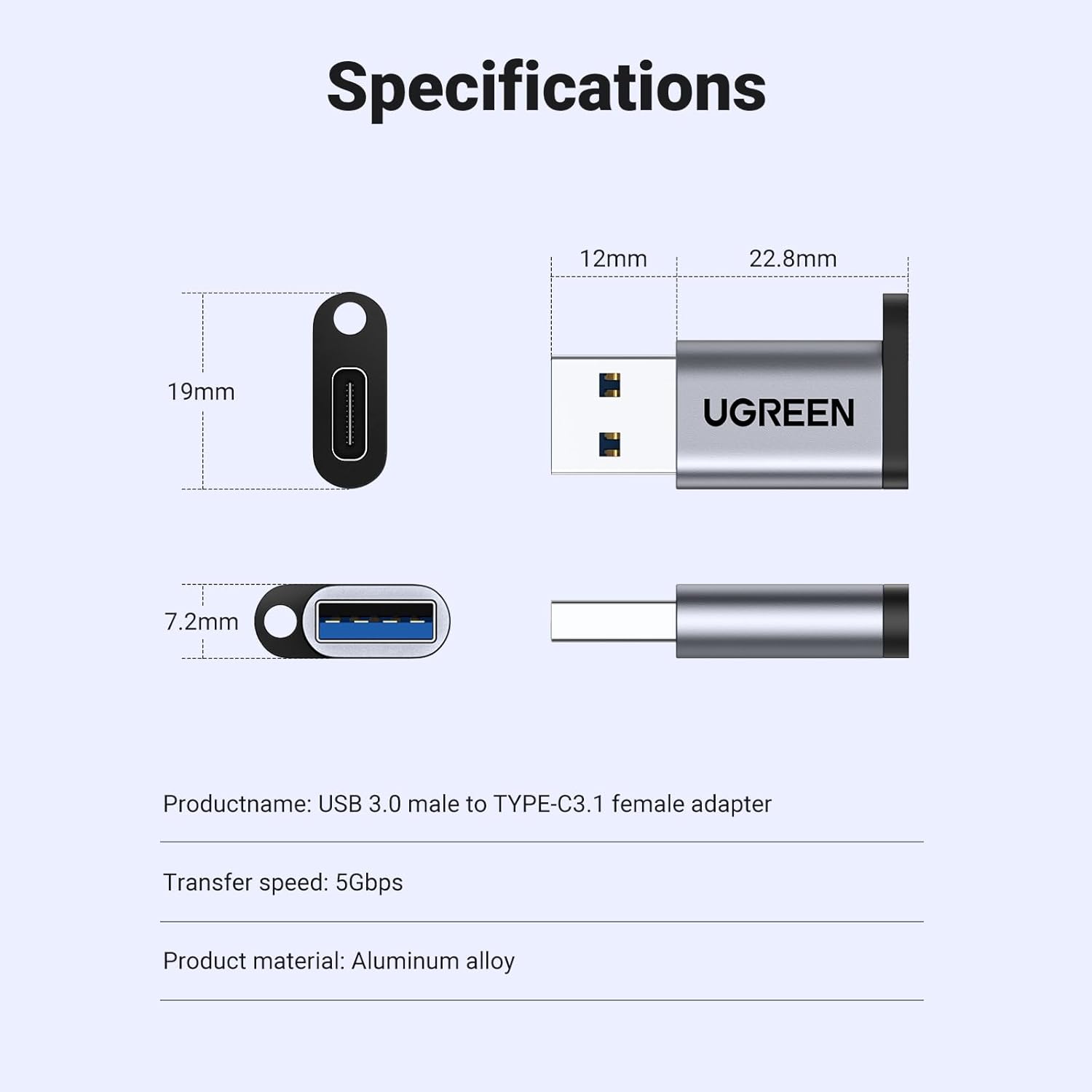 • Duradero y compacto: El adaptador USB C hembra a USB macho UGREEN cuenta con una carcasa de aleación de aluminio y una resistencia de 56 kΩ integrada para proteger la estructura del circuito interno, garantizando una carga segura y rápida con un rendimiento excelente. Su tamaño de 35 mm × 12 mm lo hace compacto y fácil de transportar.