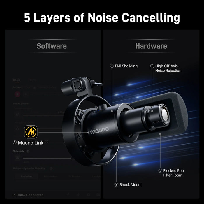Sistema de reducción de ruido de 5 niveles: El diafragma amortiguador, la reducción de ruido con un solo botón y el filtro de espuma de alta porosidad bloquean explosiones e interferencias. Los circuitos y filtros integrados eliminan el ruido electrónico, garantizando un audio nítido y sin distracciones.