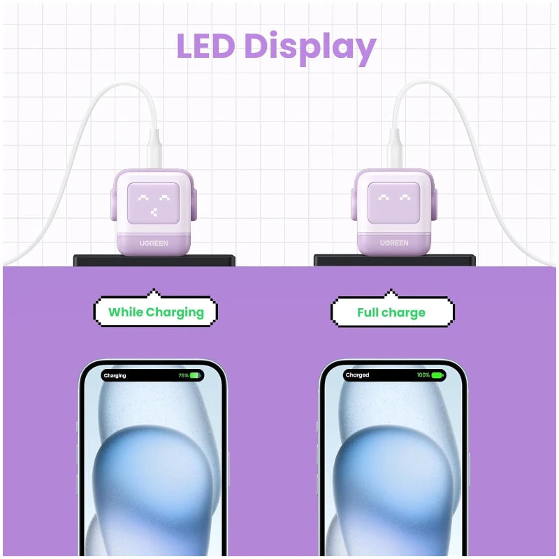 - Pantalla LED: la cara robótica LED le indica exactamente cuando los dispositivos están completamente cargados.