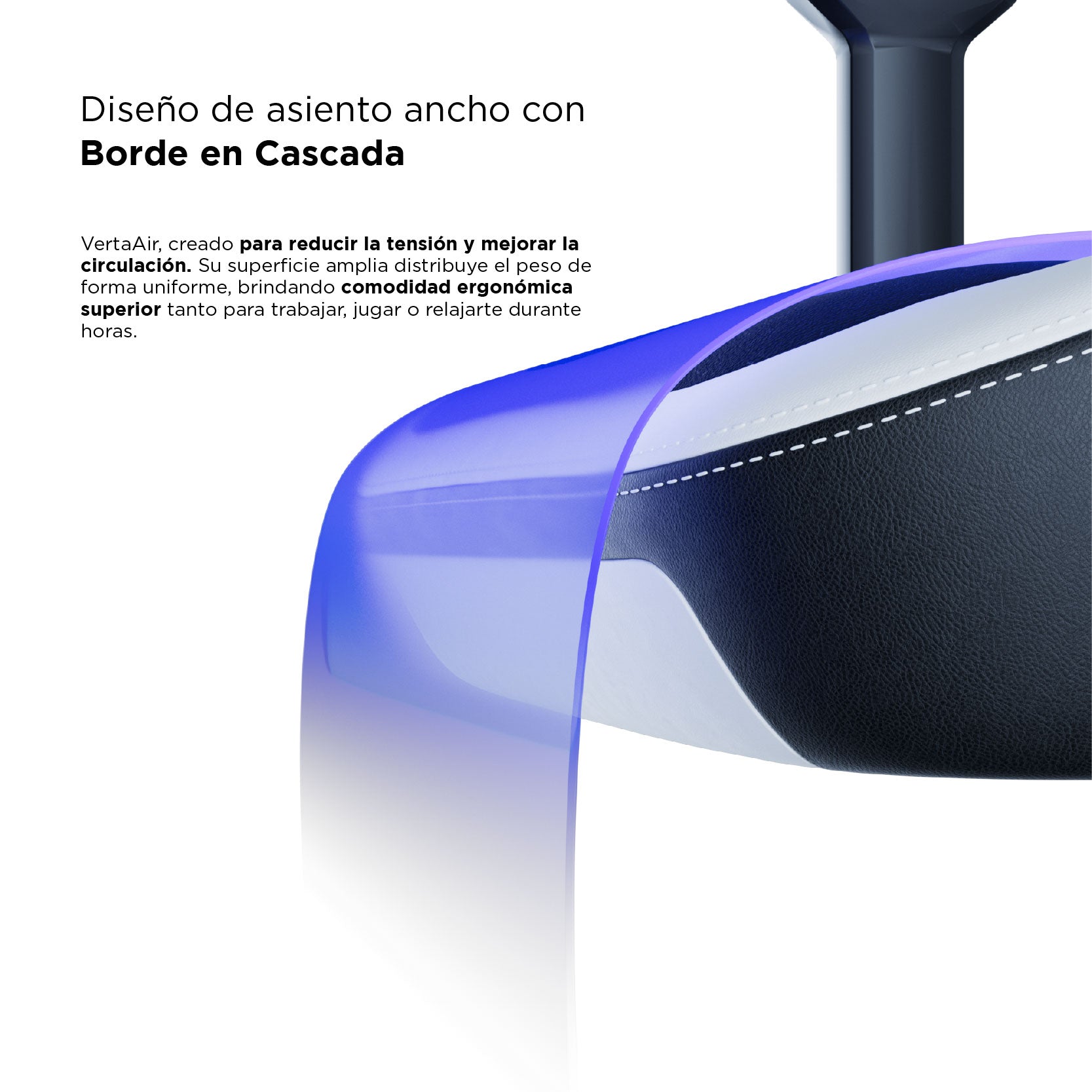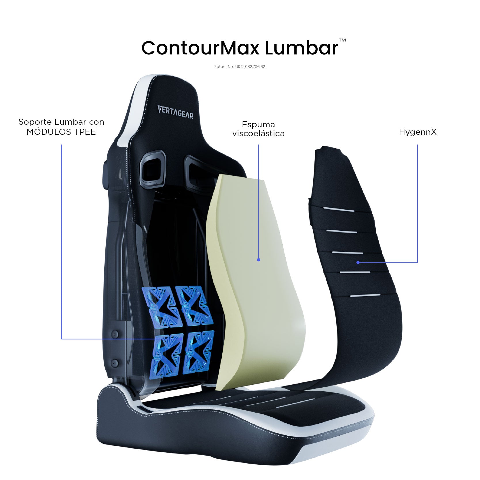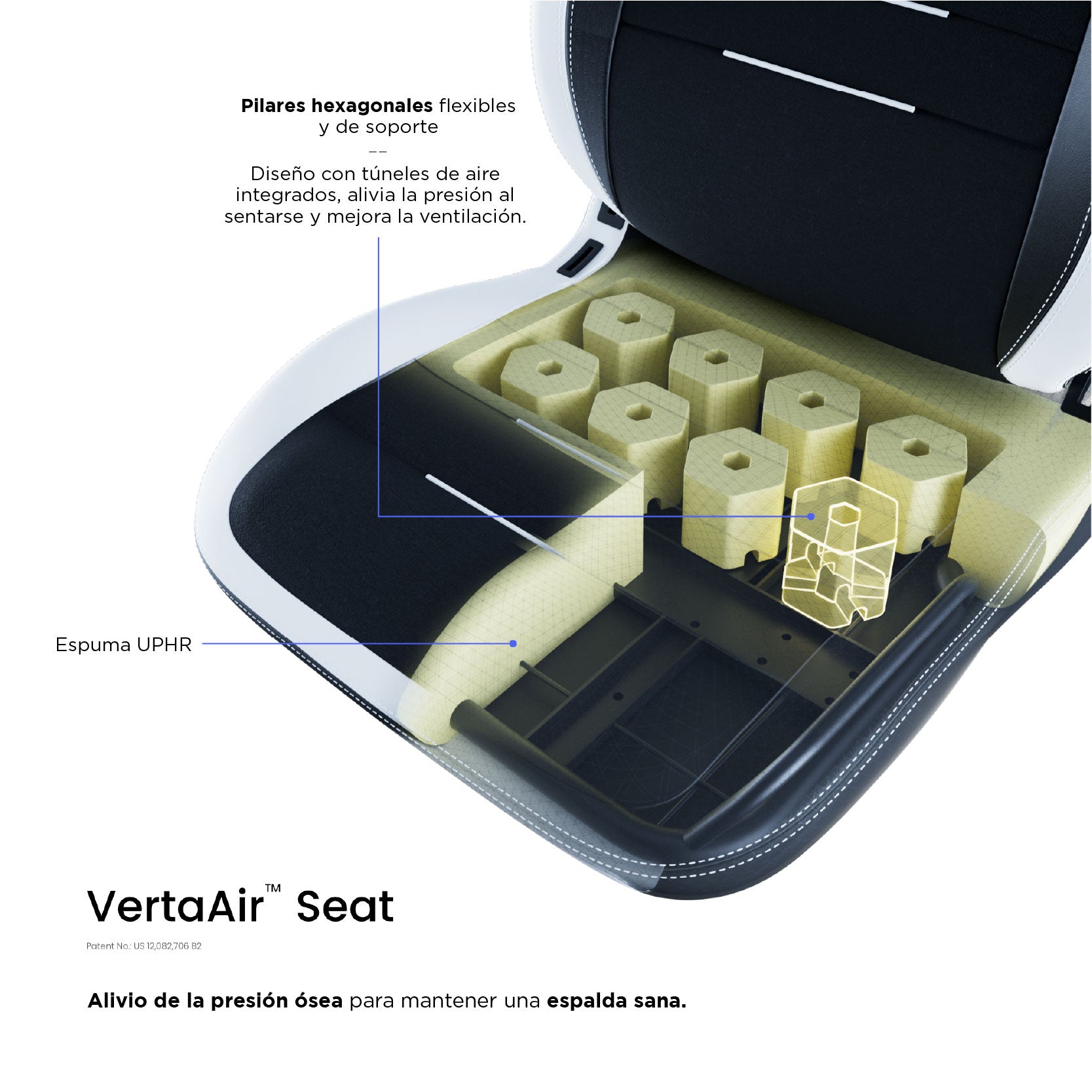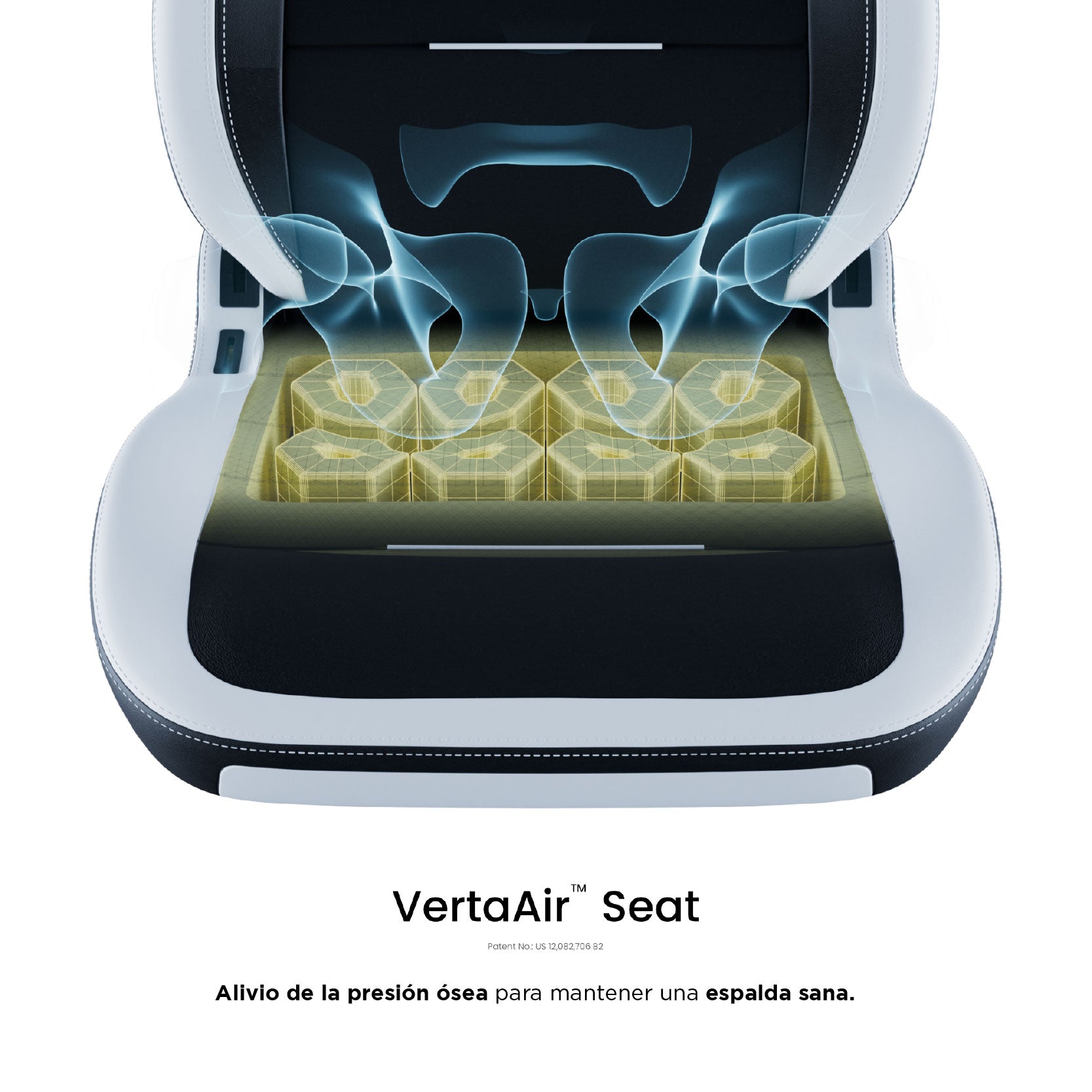 Si está luchando con la tensión y la incomodidad de la silla de juego tradicional, entendemos su dolor. Nuestro asiento VertaAir TM pendiente de patente es un concepto nuevo que resuelve los principales problemas que afectan a las sillas tradicionales. Una de las principales causas del dolor de espalda es la presión gravitatoria que no se distribuye y libera uniformemente cuando se está sentado durante horas prolongadas. El acolchado de nuestro asiento está inspirado en el principio de Bernoulli para general un levantamiento aerodinámico que puede negar la presión gravitacional de manera uniforma en la espalda y los gluteos.
