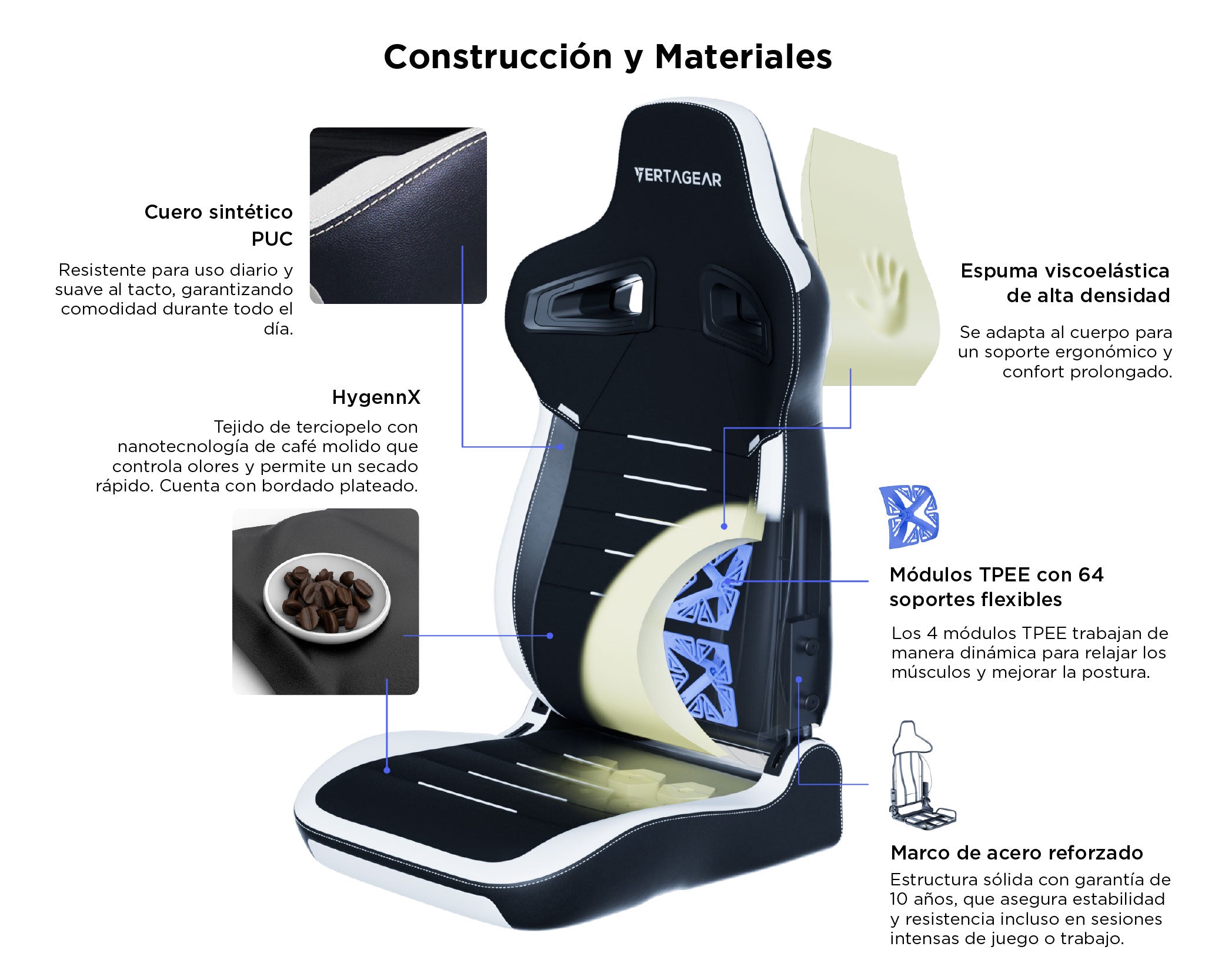 Material: Acero (marco), fibra molida de café, espuma viscoelástica, espuma UPHR, cuero PUC, aleación de aluminio (base de 5 estrellas)