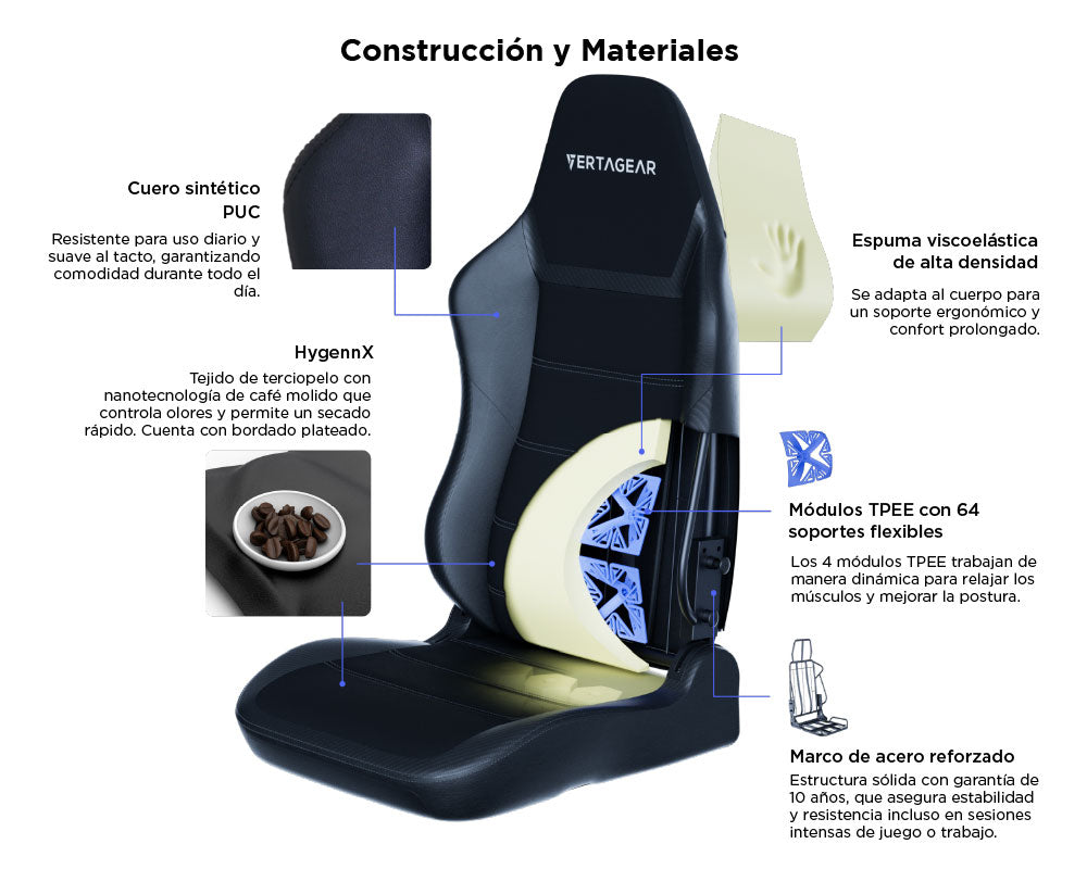 Material: Acero (marco), fibra molida de café, espuma viscoelástica, espuma UPHR, cuero PUC, aleación de aluminio (base de 5 estrellas)